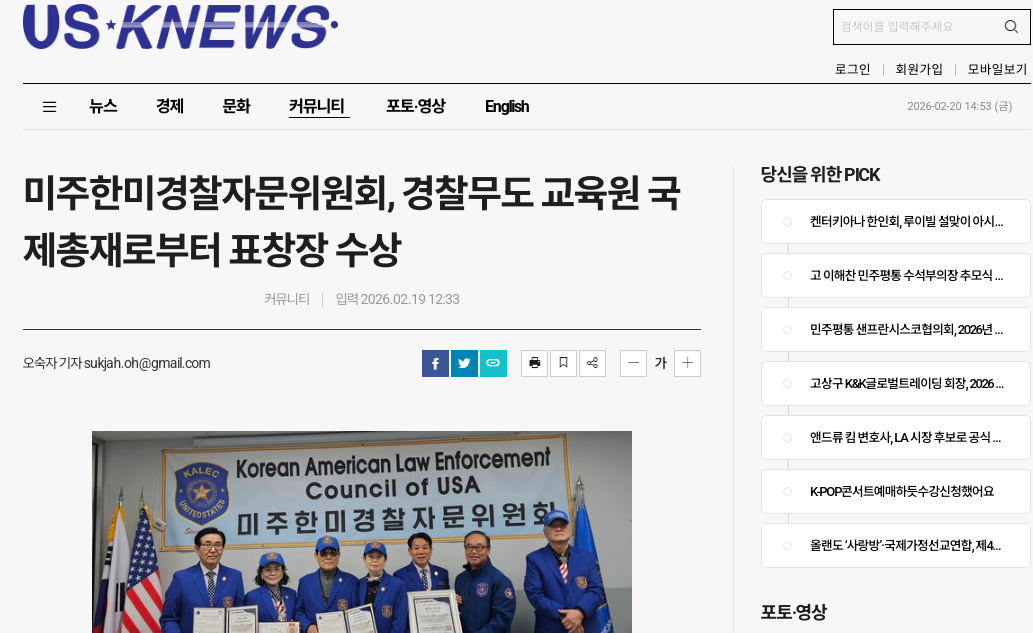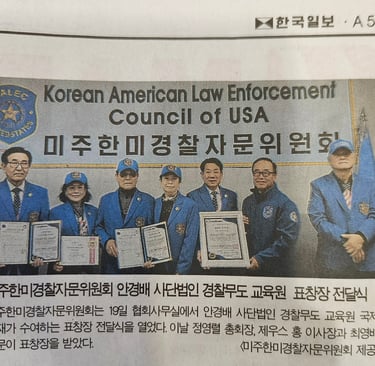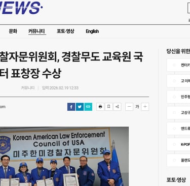 2026년 2월 19일, 본 협회 사무실에서 뜻깊은 표창장 전달식을 개최했다. 이날 행사에서는 사단법인 경찰무도 교육원 국제총재인 안경배 총재가 직접 참석해 공로자들에게 표창장을 수여했다. 이번 표창은 한미 양국 간 치안 협력 증진과 동포사회 안전 의식 향상에 기여한 공로를 인정해 수여된 것으로, 수상자는 ▲정영렬 총회장 ▲제우스 홍 이사장 ▲최영배 고문이다. 안경배 국제총재는 인사말을 통해 “미주 지역에서 한인 사회와 경찰 간 가교 역할을 성실히 수행해 온 공로에 깊이 감사드린다”며 “앞으로도 안전하고 건강한 동포사회를 만드는 데 지속적인 협력을 기대한다”고 밝혔다. 정영렬 총회장은 “이번 표창은 개인의 영광이 아니라 미주한미경찰자문위원회 전체 회원들의 헌신과 노력의 결실”이라며 “동포사회의 안전망을 더욱 촘촘히 구축하고, 차세대와 함께하는 범죄 예방 및 안전 교육 활동을 확대해 나가겠다”고 소감을 전했다.