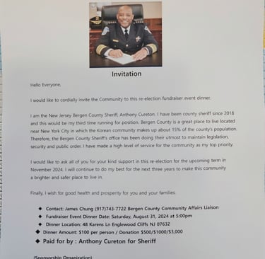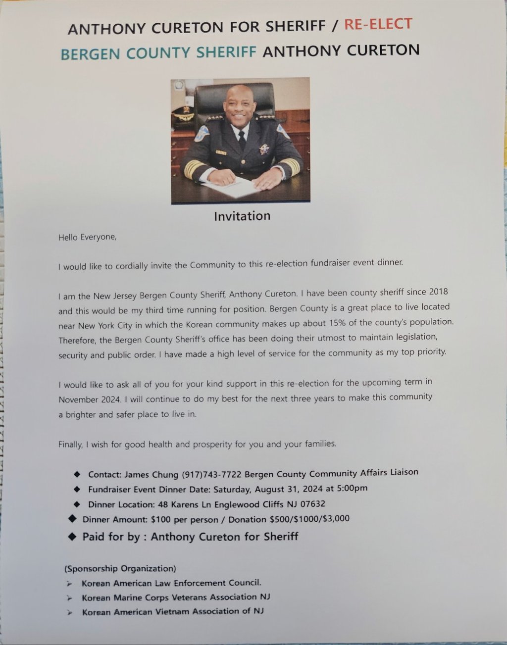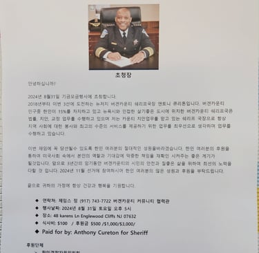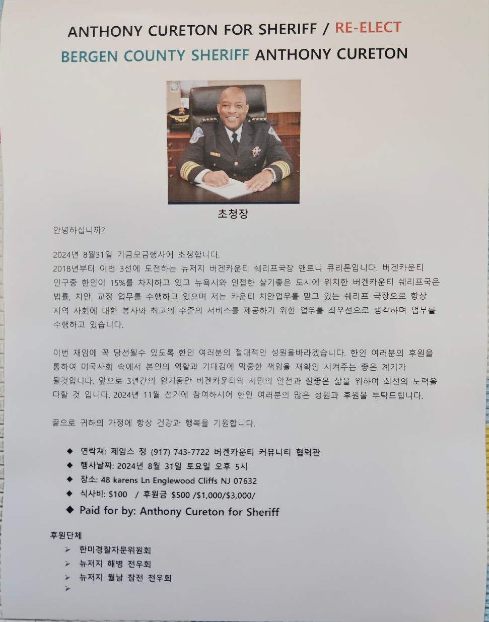 이번 후원행사는 뉴저지 버겐카운티에서 열리며, 많은 분들의 참여가 예상되고 있습니다. 특히 커뮤니티의 다양한 인사들과 함께 법 집행기관의 대표적인 인물인 쉐리프 앤토니 큐리튼을 후원하는 자리가 될 것입니다. 후원행사에 협조를 희망하시는 분들은 아래 연락처로 문의주시기 바랍니다. 신청 및 문의 전화: 917-743-7722.