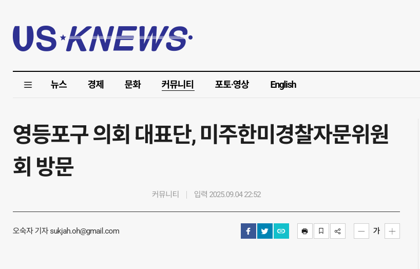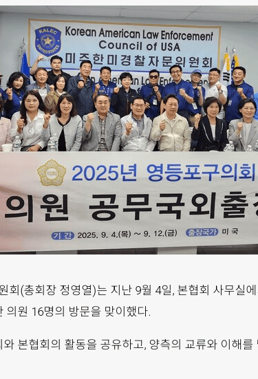 미주한미경찰자문위원회(총회장 정영열)은 9월4일 본협회 사무실에서 영등포구 의회 (의장 정선희 )외 의원16명이 본협회를 방문 집행부 임원 총이사장 제우스홍과 고문 최영배외 10여명이 참석하였다. 의원들은 한인사회 활동 사항과 본협회 활동 사항을 경청하며 뉴욕 뉴저지에 치안에 대한 본협회 브리핑을듣고 한국과의 비교하는 시간을 들었다. 영등포구의 첨단 치안 시스템은 세계 최고임을 확인하는 자리였다. 또한 장래의 긴밀한 정보 교류와 상호협력을 약속하였다.
