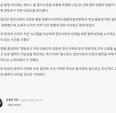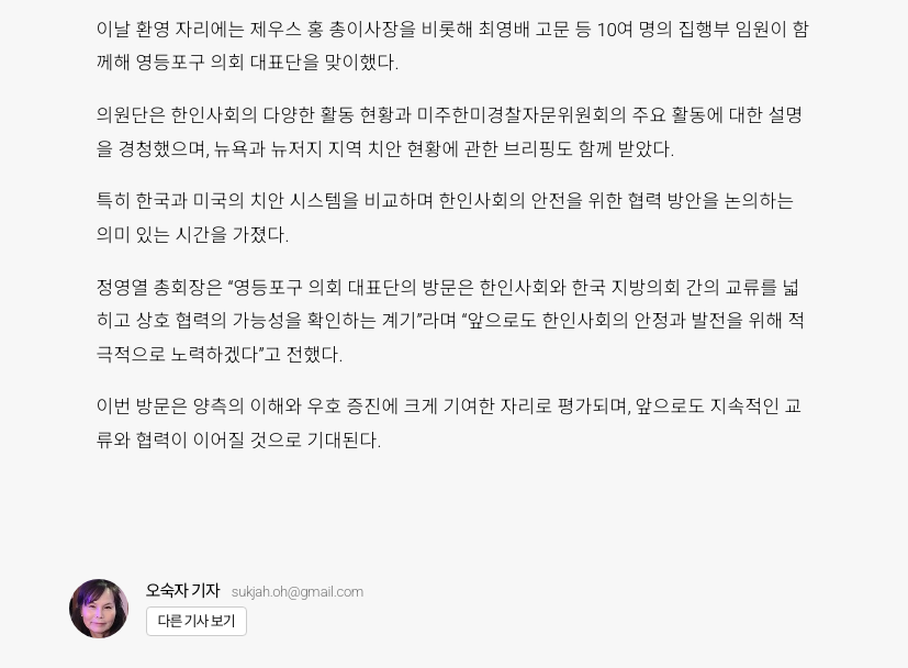 지난 9월 4일, 영등포구 의장 정선희를 비롯한 의원 16명이 본협회를 방문하여, 의원들과 집행부 임원 총이사장 제우스홍, 고문 최영배 등 10여명이 함께 자리했습니다. 이 자리에서는 한인사회 활동과 본협회의 운영 사항에 대한 경청이 있었습니다. 의원들은 뉴욕 및 뉴저지 지역의 치안 상황에 대한 브리핑을 받고, 한국과의 비교를 통해 치안 체계의 우수성을 확인하는 시간을 가졌습니다.