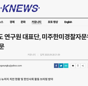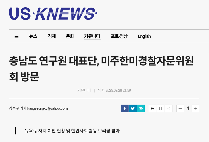 2025년 9월 25일 오후 3시, 충남도청 소속 연구원 3명이 미주한미경찰자문회 사무실을 방문하였다. 이 방문의 주된 목적은 충청남도가 중앙 경찰학교를 유치하기 위한 연구와 모범 사례 탐방이었다. 이를 통해 미국 뉴욕 및 뉴저지 지역의 경찰아카데미 시스템을 깊이 있게 이해하고, 한인 동포사회의 활동 현황을 파악하려 하였다.