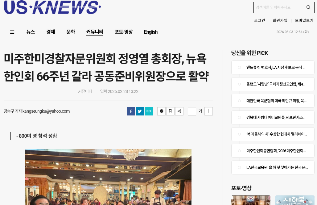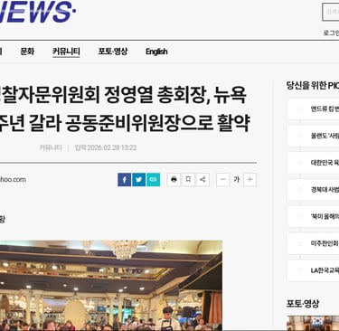 "정영열 총회장, 뉴욕한인회 66주년 갈라 공동준비위원장으로 활약" 정영열 총회장이 뉴욕한인회 66주년 기념 갈라 행사에서 공동준비위원장으로 참여해 행사를 성공적으로 이끌었다. 정 총회장은 인사말을 통해 “66년의 역사는 선배 이민자들의 헌신과 희생 위에 세워진 소중한 유산”이라며 “이번 갈라가 과거를 돌아보고 미래를 향한 새로운 도약을 다짐하는 계기가 되길 바란다”고 밝혔다. 또한 “한인사회가 세대를 잇는 연대와 협력으로 더욱 굳건히 성장해 나가야 한다”고 강조했다. 행사장에는 정·재계, 경제계, 문화계 인사들과 지역사회 리더들이 참석해 자리를 빛냈으며, 축사와 공연, 감사패 전달 등 다채로운 프로그램이 이어졌다. 특히 800여 명이 한자리에 모여 뉴욕 한인사회의 단합과 위상을 보여주었다는 평가다.